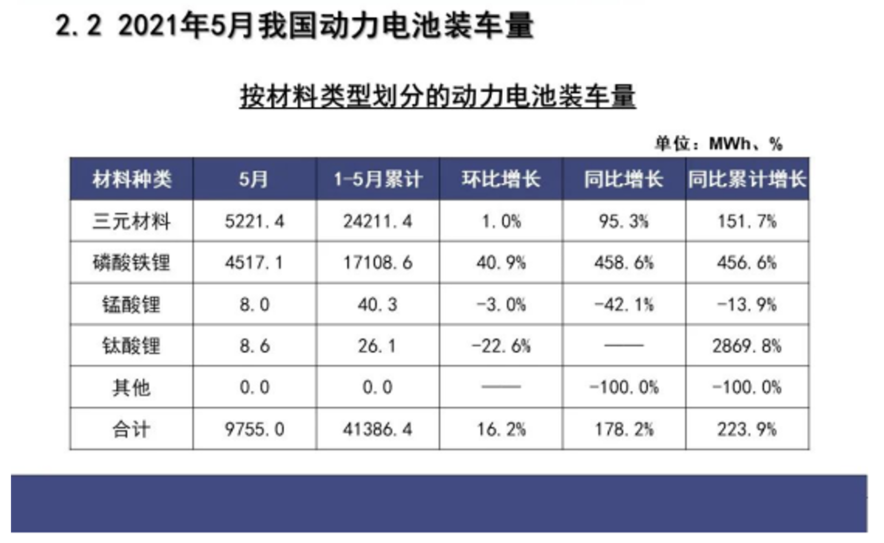 今年前5个月,我国动力电池装车量累计41. 4GWh,同比累计上升223.9%。其中三元电池装车量累计24.2GWh,占总装车量58.5%,同比累计上升151.7% ;磷酸铁锂电池装车量累计17.1GWh,占总装车量41.3%,同比累计上升456.6%。