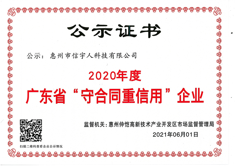 On June 1, the Guangdong provincial market supervision and administration bureau made a public announcement on the "contract abiding and credit respecting" enterprises in Guangdong Province in 2020. Shenzhen xinyuren Technology Co., Ltd. and its wholly-owned subsidiary Huizhou xinyuren Technology Co., Ltd. successfully passed the audit by virtue of their good credit system and good faith corporate image, Shuangshuang won the title of "contract abiding and credit respecting" enterprise in Guangdong Province in 2020.